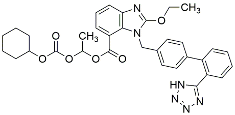 Purity:≥ 98% (Assay by titration, HPLC)Synonym:2-Ethoxy-1-[[2'-(2H-tetrazol-5-yl)[1,1'-biphenyl]-4-yl]methyl]-1H-Benzimidazole-7-carboxylic acid 1-[[(cyclohexyloxy)carbonyl]oxy]ethyl esterCatalog Number:37727CAS Number:145040-37-5Purity Limit:≥ 98% (Assay by titration, HPLC)MDL NO:MFCD00871371Molecular Formula:C33H34N6O6Molecular Weight:610.67