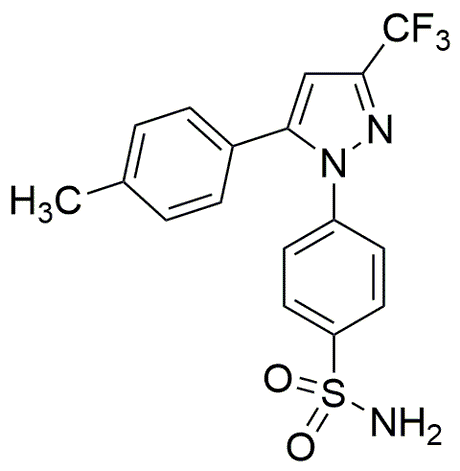 Grade:USPPurity:98 - 102% (Assay on anhydrous basis)Synonym:4-[5-(4-Methylphenyl)-3-(trifluoromethyl)-1H-pyrazol-1-yl]benzenesulfonamideCatalog Number:37734Grade:USPCAS Number:169590-42-5Purity Limit:98 - 102% (Assay on anhydrous basis)MDL NO:MFCD00941298Molecular Formula:C17H14F3N3O2SMolecular Weight:381.37