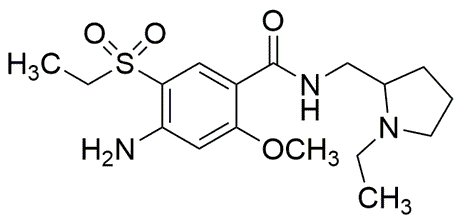 Purity:≥ 98% (Assay by titration, HPLC)Synonym:4-Amino-N-[(1-ethyl-2-pyrrolidinyl)methyl]-5-ethylsulfonyl-2-methoxybenzamideCatalog Number:37585CAS Number:71675-85-9Purity Limit:≥ 98% (Assay by titration, HPLC)MDL NO:MFCD00866691Molecular Formula:C17H27N3O4SMolecular Weight:369.48