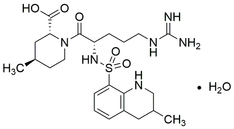 Purity:≥ 99% (HPLC)Synonym:(2R,4R)-1-[(2S)-5-[(Aminoiminomethyl)amino]-1-oxo-2-[[(1,2,3,4-tetrahydro-3-methyl-8-quinolinyl)sulfonyl]amino]pentyl]-4-methyl-2-piperidinecarboxylic acid monohydrateCatalog Number:37606CAS Number:141396-28-3Purity Limit:≥ 99% (HPLC)MDL NO:MFCD00895735Molecular Formula:C23H36N6O5S·H2OMolecular Weight:526.66