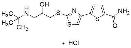 HazmatPurity:≥ 98% (HPLC)Synonym:5-[2-[[3-(tert-Butylamino)-2-hydroxypropyl]thio]thiazol-4-yl]thiophene-2-carboxamide hydrochlorideHazmatCatalog Number:37622CAS Number:68377-91-3Purity Limit:≥ 98% (HPLC)MDL NO:MFCD00941421Molecular Formula:C15H21N3O2S3·HClMolecular Weight:407.99