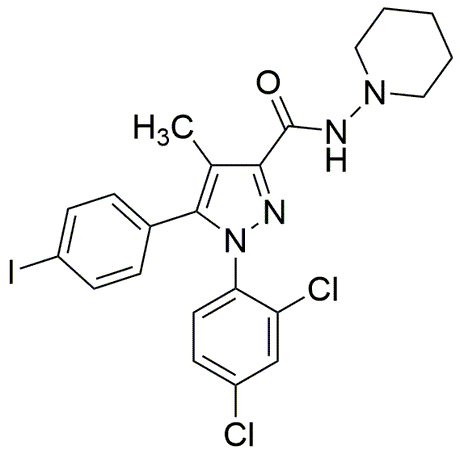 Purity:≥ 97% (HPLC)Synonym:1-(2,4-Dichlorophenyl)-5-(4-iodophenyl)-4-methyl-N-(piperidin-1-yl)-1H-pyrazole-3-carboxamideCatalog Number:37624CAS Number:183232-66-8Purity Limit:≥ 97% (HPLC)MDL NO:MFCD01861181Molecular Formula:C22H21Cl2IN4OMolecular Weight:555.24