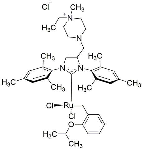 Purity:≥ 95% (HPLC)Synonym:[1,3-Bis(2,4,6-trimethylphenyl)-4-[(4-ethyl-4-methylpiperazinium-1-yl)methyl]-2-imidazolidinylidene]dichloro(2-isopropoxybenzylidene)ruthenium(II) ChlorideCatalog Number:41259CAS Number:1414707-08-6Purity Limit:≥ 95% (HPLC)MDL NO:MFCD28411647Molecular Formula:C39H55Cl3N4ORuMolecular Weight:803.32