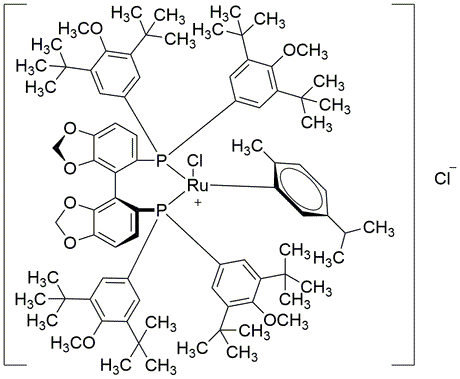 Synonym:Chloro[(R)-(-)-5,5'-bis[bis(3,5-di-tert-butyl-4-methoxyphenyl)phosphino]-4,4'-bi-1,3-benzodioxole](p-cymene)ruthenium(II) chlorideCatalog Number:40792CAS Number:944451-32-5MDL NO:MFCD09753019Molecular Formula:C84H114Cl2O8P2RuMolecular Weight:1485.75 -