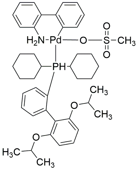 Purity:≥ 97% (Assay by elemental analysis)Synonym:Methanesulfonato(2-dicyclohexylphosphino-2',6'-di-i-propoxy-1,1'-biphenyl)(2'-amino-1,1'-biphenyl-2-yl)palladium(II)Catalog Number:37082CAS Number:1445085-77-7Purity Limit:≥ 97% (Assay by elemental analysis)MDL NO:MFCD22572684Molecular Formula:C43H56NO5PPdSMolecular Weight:836.37