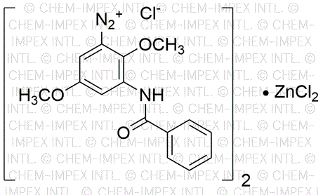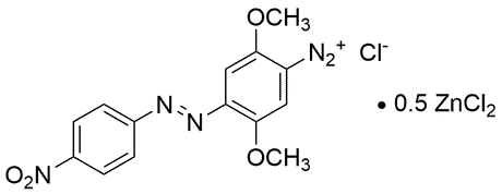 Grade:CI 37190Synonym:2,5-Dimethoxy-4-(4-nitrophenylazo)benzenediazonium chloride zinc chlorideCatalog Number:38633Grade:CI 37190CAS Number:64071-86-9MDL NO:MFCD00078471Molecular Formula:C14H12ClN5O4·0.5ZnCl2Molecular Weight:417.87
