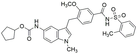 Purity:≥ 98% (HPLC)Synonym:Cyclopentyl N-[3-[[2-Methoxy-4-[[[(2-methylphenyl)sulfonyl]amino]carbonyl]phenyl]methyl]-1-methyl-1H-indol-5-yl]carbamateCatalog Number:38371CAS Number:107753-78-6Purity Limit:≥ 98% (HPLC)MDL NO:MFCD00864775Molecular Formula:C31H33N3O6SMolecular Weight:575.68