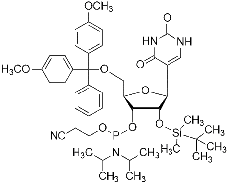 Purity:≥ 93% (HPLC)Synonym:DMT-2'-O-TBDMS-pseudouridine phosphoramiditeCatalog Number:48065CAS Number:163496-23-9Purity Limit:≥ 93% (HPLC)MDL NO:MFCD10686988Molecular Formula:C45H61N4O9PSiMolecular Weight:861.06