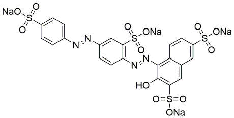 Catalog Number:42520CAS Number:1064-48-8Purity Limit:≥ 50 % (teneur en colorant)MDL NO:MFCD00004017Molecular Formula:C22H14N6Na2O9S2Molecular Weight:616.49