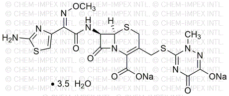 Grade:Conforme aux spécifications USPPurity:≥ 795 ìg/mg (dosage sur une base anhydre)Catalog Number:22108Grade:Conforme aux spécifications USPCAS Number:104376-79-6Purity Limit:≥ 795 ìg/mg (dosage sur une base anhydre)MDL NO:MFCD00941454Molecular Formula:C 18 H 16 N 8 Na 2 O 7 S 3 ·3,5H 2 OMolecular Weight:661.58 -